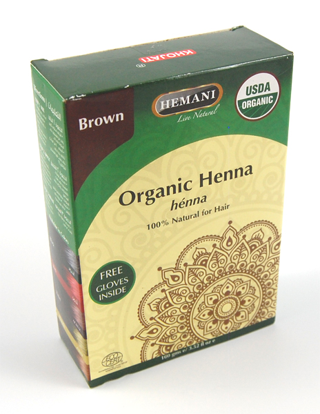 Henné Bio de marque Hemani-Khojati pour coloration marron à bases de plusieurs plantes naturelles utilisées pour leur teinte. 100% naturelle. Fournie avec une paire de gants.