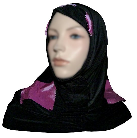 Très beau hijab 2 pièces noir avec carreaux mauves satinés et strass. Matière polycoton fluide et agréable à porter.