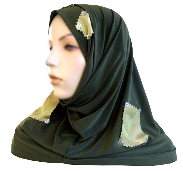 Très beau hijab 2 pièces kaki avec carreaux verts clairs satinés et strass.