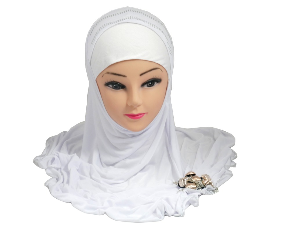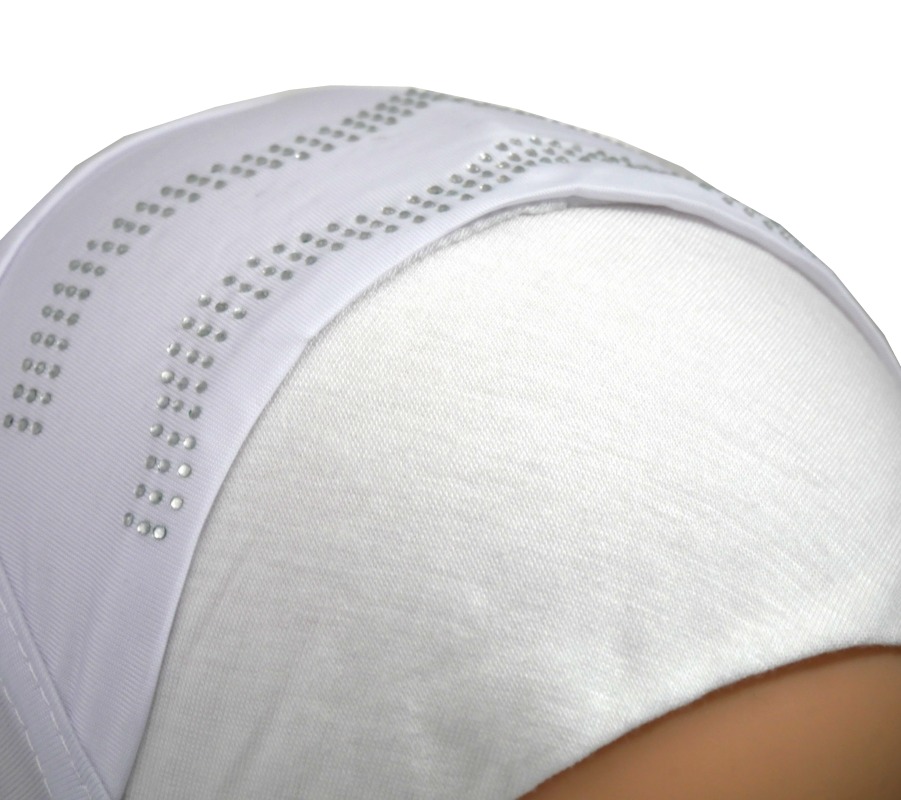 Hijab 1 pièce blanc pailleté décoré de strass motifs ondulés avec une décoration en argent accompagnée de fines chaines. Contour cousu fil argenté.