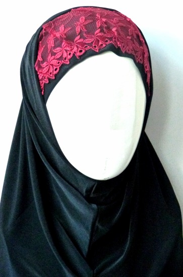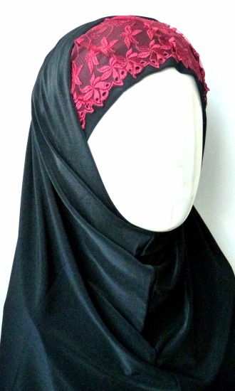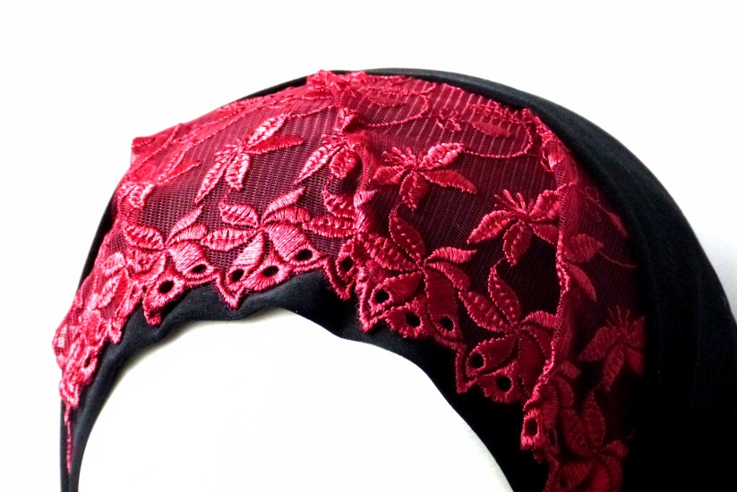Hijab noir 2 pieces avec dentelle a motifs fleurs rouges