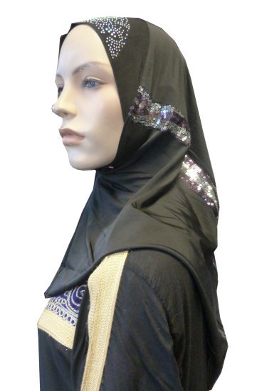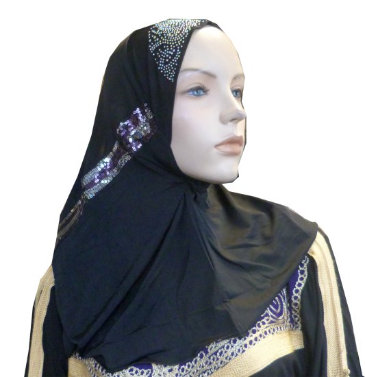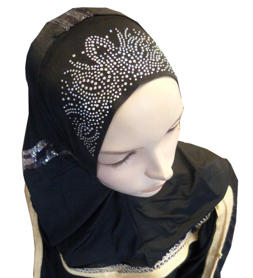 Collection : Hijab 1 pièce noir avec strass sur le bonnet et bandes pailletées.