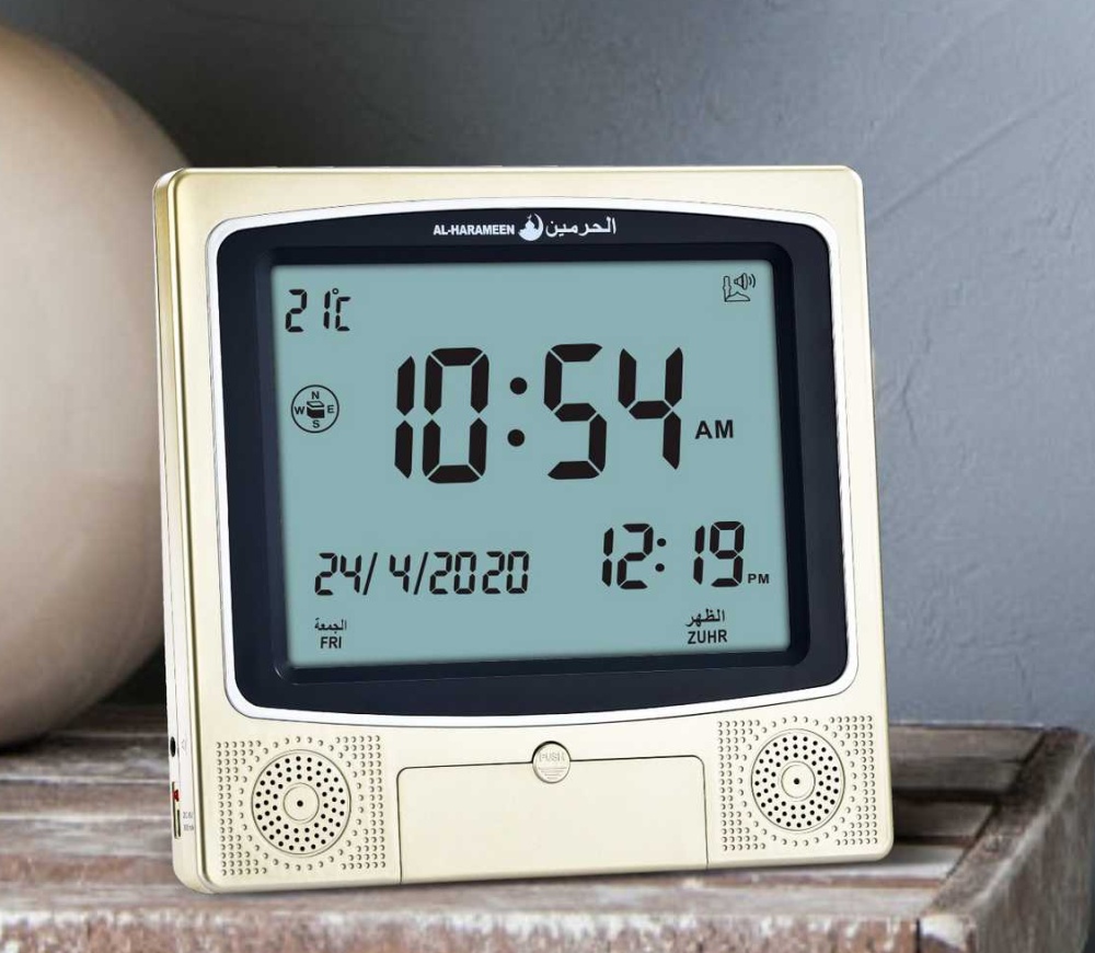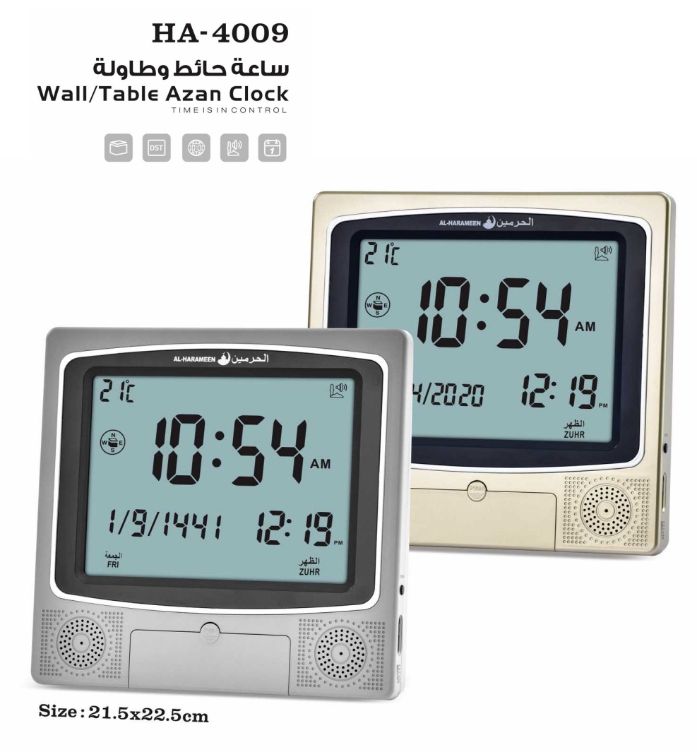 Horloge (modèle HA-4009) avec calcul automatique des heures de prières pour toutes les villes du monde. Une fois réglée les heures de prières sont modifiées chaque jour par le programme de l'horloge.