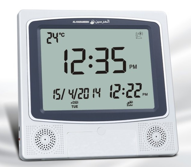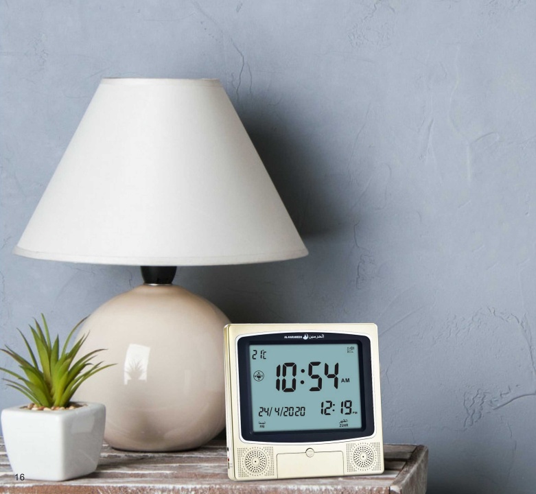 Automatic Iqamah alarm for all prayer: This unique feature remind you every day exactly at the same time relative to azan. For example, suppose you set the alarm to 5:15 AM and the Fajr azan is at 5:05 AM. On the next day, if Fajr azan becomes 5:06 AM, then automatically this alarm will change to 5:16 AM. In this case, you will wake up 10 minutes after Fajr azan every day. Daily alarm : Alarm to work and school. The daily alarm is a regular alarm that rings at the same time everyday. Moreover, this alarm can be set not to ring on weekends.Qibla direction (relative to the North) can be displayed. Qibla angle will also be displayed between 0 and 360 degree, clockwise from North. Hijri and gregorian calendars : Al Harameen clock can be displayed both the Hijr and Gregorian calendars every 10 seconds or you can choose one of them press H-G when displayed. The Hijri calendar follows the Gregorian date and is based on the astronomical moon sighting at Mecca.Temprature display: Temperature reading in Celsius (°C) and Fahrenheit (°F) is displayed.Full screen El light Snooze option DC 6 Volts external input 300MA Audio out (Connect with speaker) Daylight Saving Time option ( for countries using this system ) Gentle prayers reminder (when azan sound is turned off) Could easily add a new city (Longitude & Longitude&GMT information) Could easily modify the difference time prayer to the outskirts of cities adopted it Crescendo sound: All alarms have gentle wake-up sound that increase graduallyOne Time Alarm: In addition to Fajr and daily alarms, AL-HARAMEEN clock includes an extra alarm ( called 1-Day alarm ). It can be set to ring for special appointments.