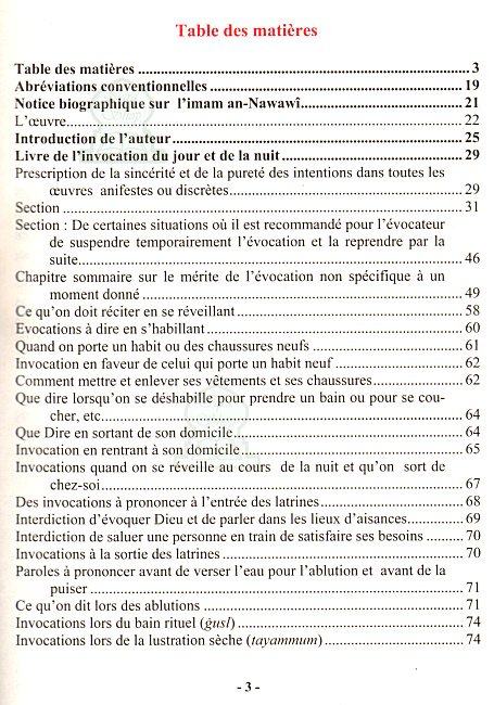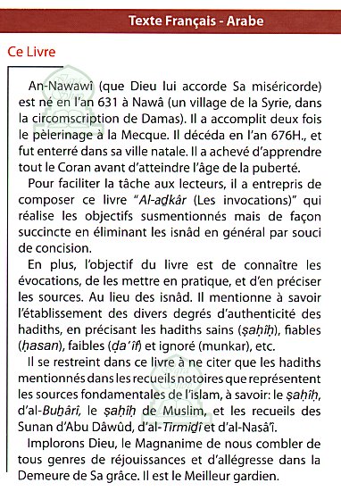 Pour faciliter la tâche aux lecteurs, il a entrepris de composer ce livre "Al-adkâr (Les invocations)" qui réalise les objectifs susmentionnés mais de façon succincte en éliminant les isnâd en général par souci de concision.