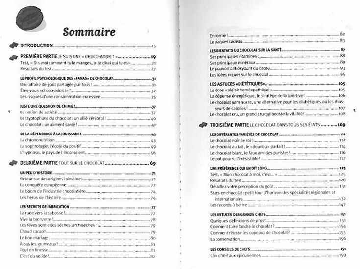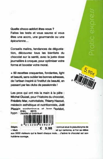 Quelle choco-addict êtes-vous ? Faites les tests et vous saurez si vous êtes une accro, une gourmande ou une épicurienne... Conseils malins, tendances de dégustation, découvrez tous les bienfaits du chocolat sur la santé, avec la juste dose journalière à croquer, pour optimiser votre forme et booster votre moral. 50 recettes craquantes, fondantes, light et beauté, sans oublier les bonnes adresses, de l'artisan inspiré à l'institut de beauté, en passant par les clubs de passionnés ! Les pros qui ont mis la main à la pâte : Michel Cluizel, pour l'histoire du chocolat, Frédéric Mar, nutrivitaliste, Thierry Hazout, médecin esthétique et nutritionniste, Joël Plessis, sophrologue, et Jean Doridot, hypnothérapeute.