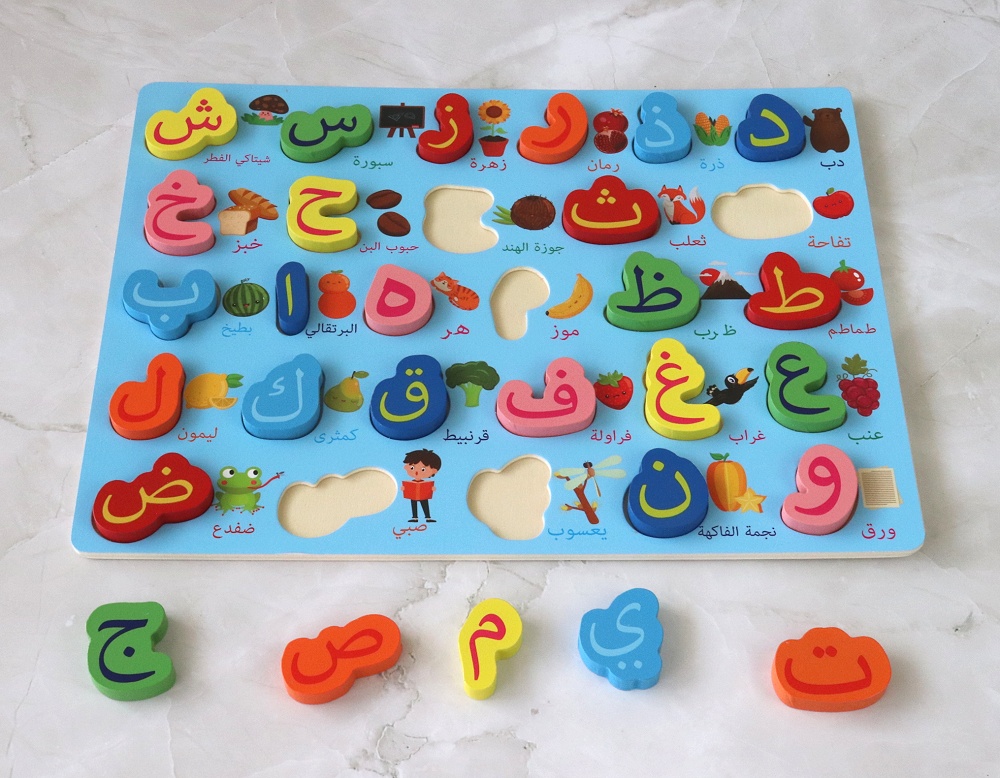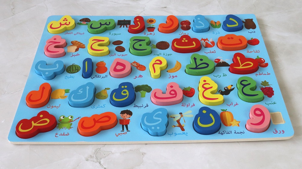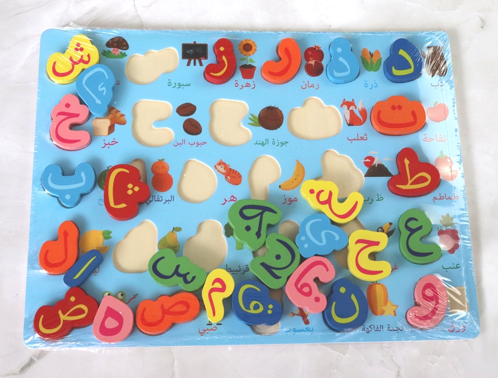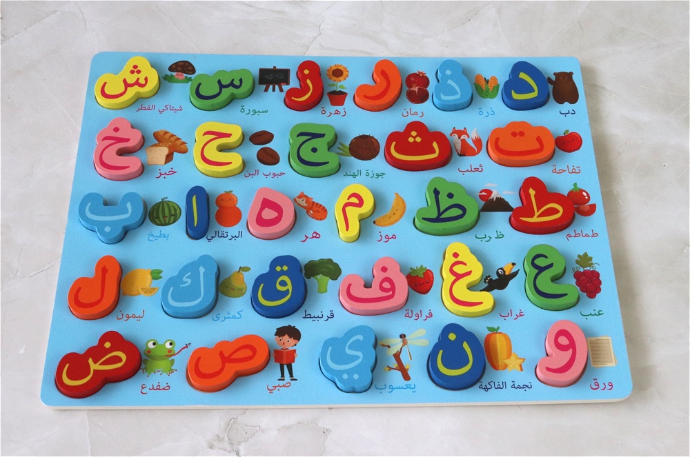 Jeu alphabet arabe en bois - Puzzle grosses lettres de l'alphabet multicouleurs. Chaque lettre peut rentrer à un seul emplacement.