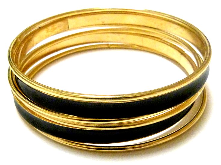 Lot de 6 bracelets : 2 en métal dorés garnis d'une bande noire accompagnés de 4 bracelets simples