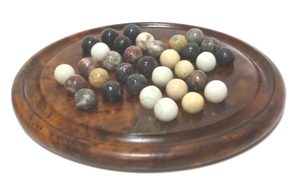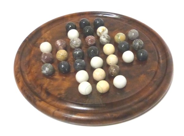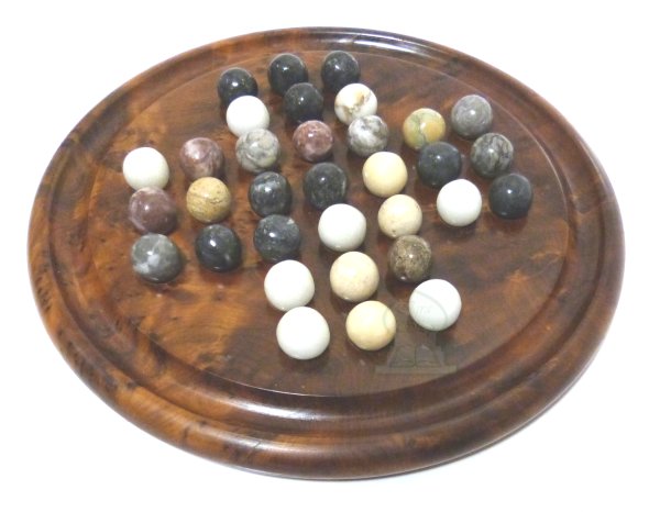 Jeux de solitaire, jeu de société de fabrication artisanale, en racine de thuya ; il est constitué d'un plateau de forme ronde, de 22 cm de diamètre, et de fabuleuses billes en pierre et en marbre...