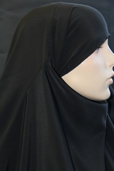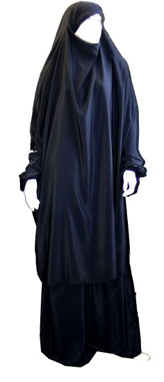 Ce Jilbab deux pièces est composé d’un demi-jilbab (grande cape avec bandeau intégré) avec manches élastiques, et d’une jupe assortie.