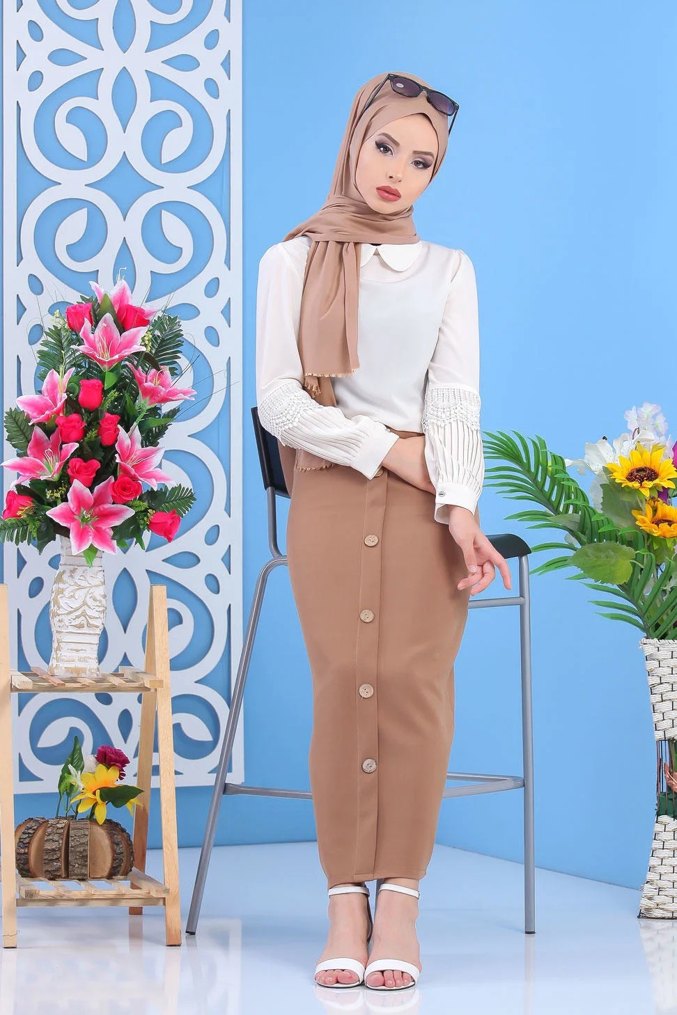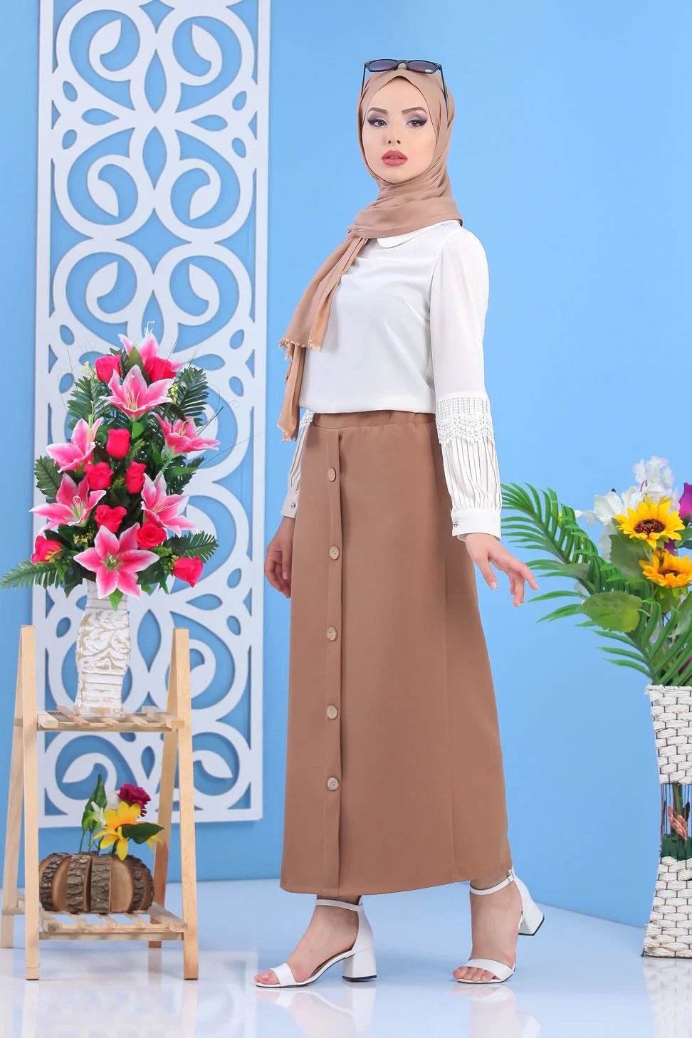 Jupe longue décorée de boutons (Vetement hijab) - Couleur rose poudré - REF. 36550 (24.90 €)