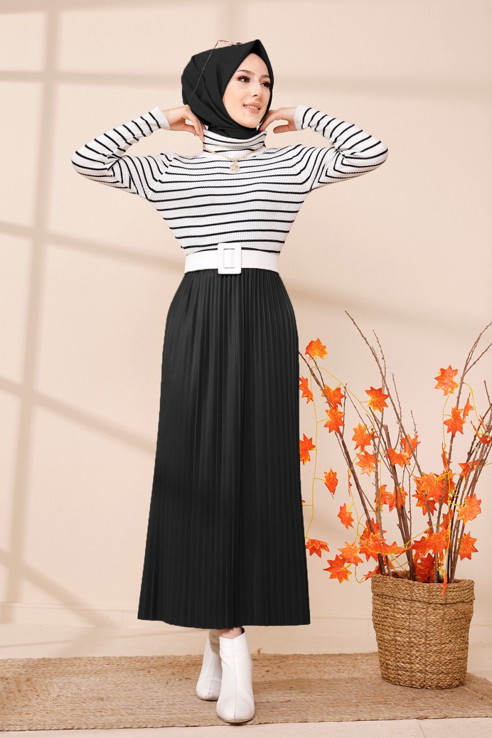 Ensemble tunique et jupe plissée de couleur noire (Vetement pudique et chic pour femme - Marque Amelis) - REF. 30487 (48.00 €) - En Promotion à 38.00 €