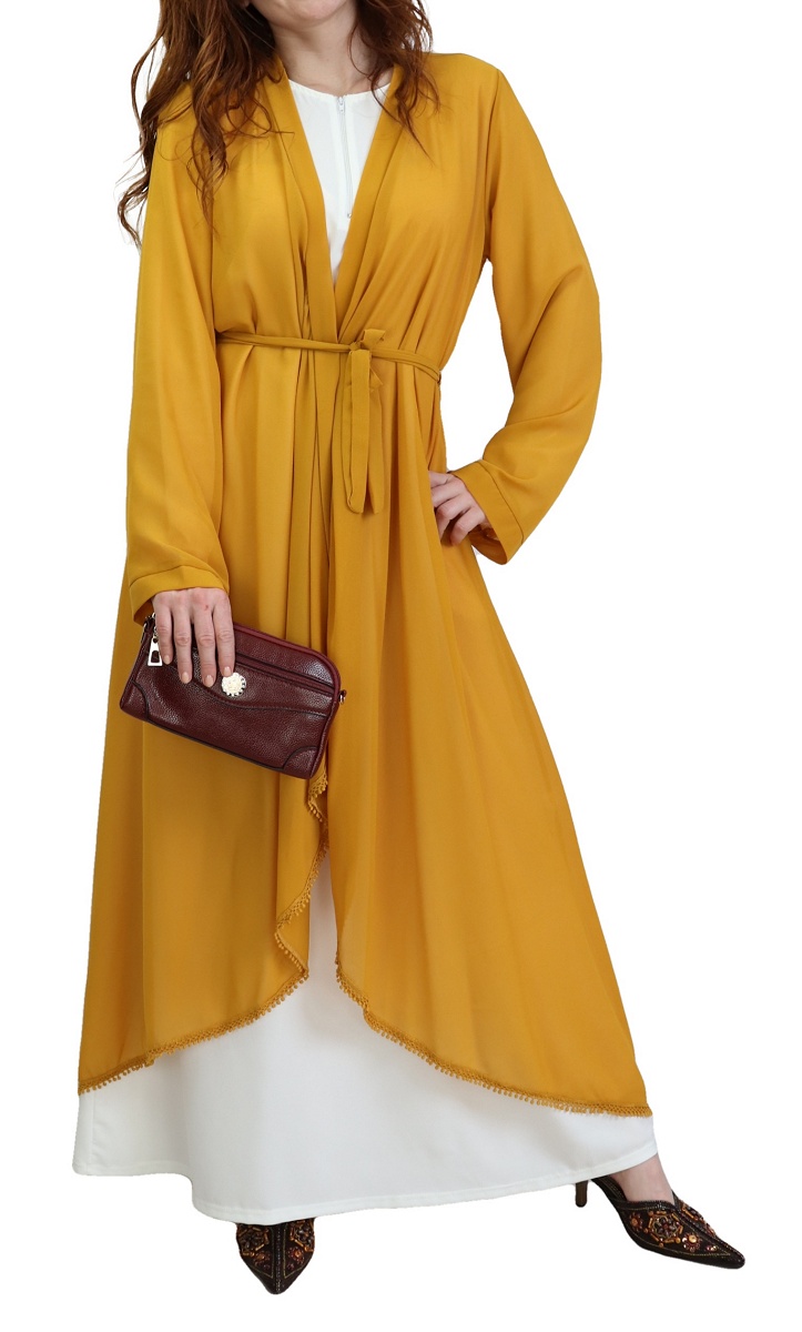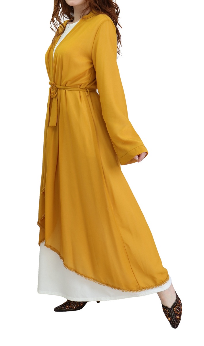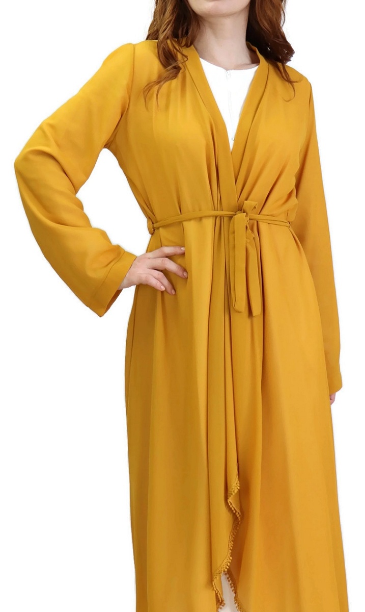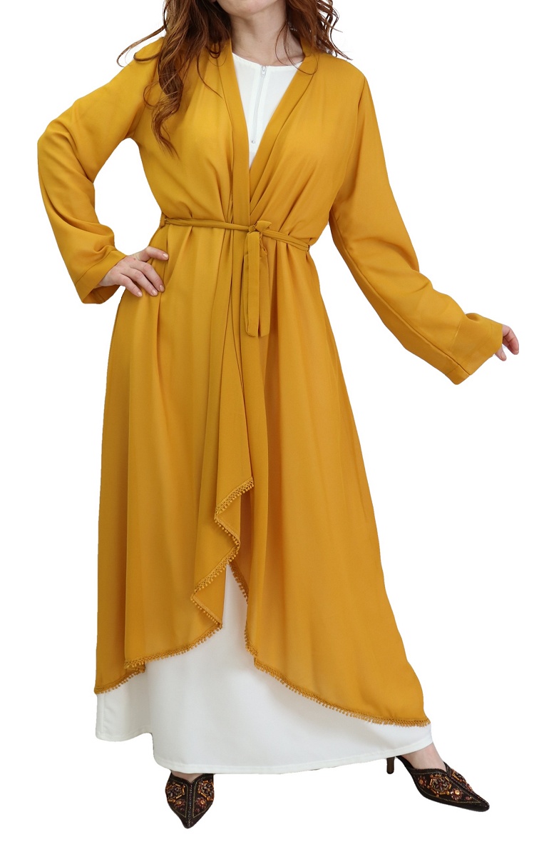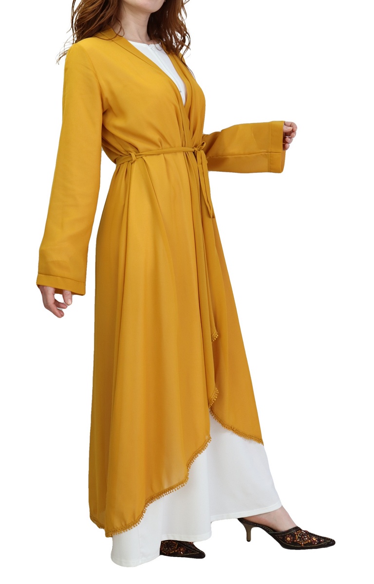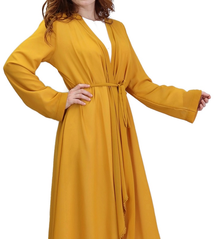 Kimono long plissé style oriental avec décorations et strass pour femme - Couleur jaune moutarde - REF. 30688 (32.00 €) - En Promotion à 24.90 €