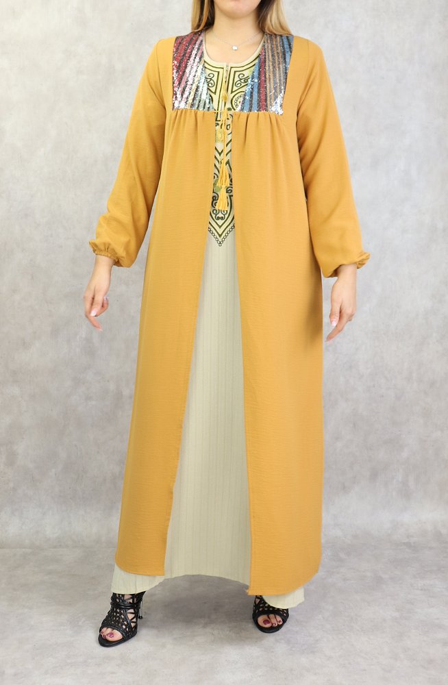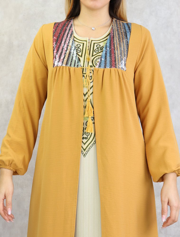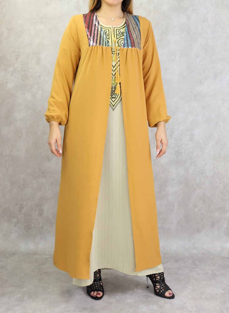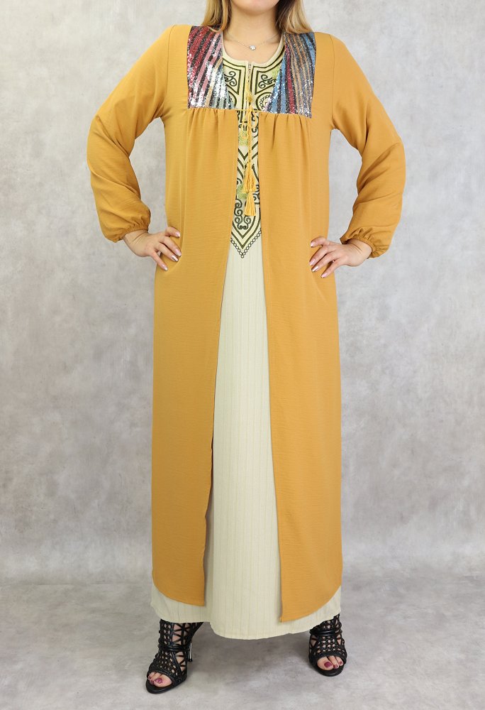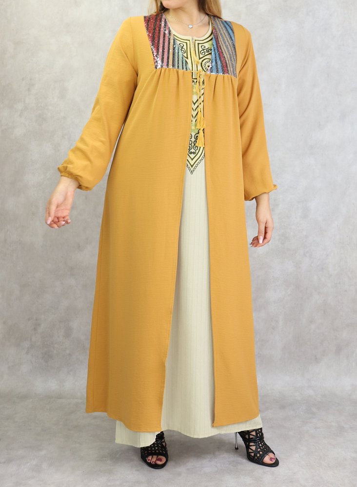 Kimono long avec strass pour femmes - Couleur jaune moutarde Vetement & Accessoire