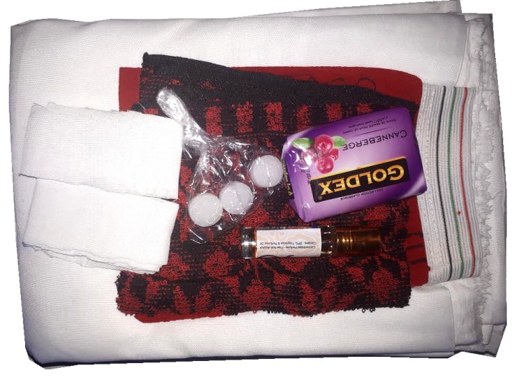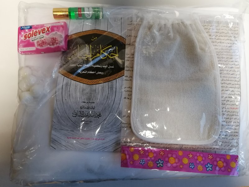 Kit linceul complet pour femme, conforme à la tradition prophétique "La Sunna". Le kit contient le nécessaire pour effectuer entièrement la toilette rituelle de la défunte (Tissus linceuls , gant, savon, parfum, camphre).
