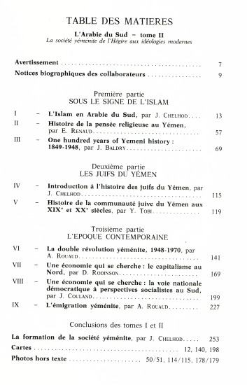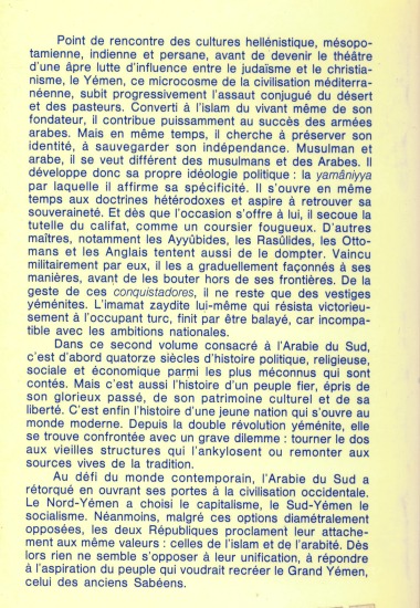 Dans ce second volume consacré à l'Arabie du Sud, c'est d'abord quatorze siècles d'histoire politique, religieuse, sociale et économique qui sont contés. Mais c'est aussi l'histoire d'un peuple fier, épris de son glorieux passé, de son patrimoine culturel et de sa liberté. C'est enfin l'histoire d'une grande nation qui s'ouvre au monde moderne. Depuis la double révolution yéménite, elle se trouve confrontée avec un grave dilemme : tourner le dos aux vieilles structures qui l'ankylosent ou remonter aux sources vives de la tradition.