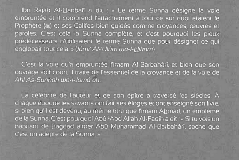 C'est la voie qu'a empruntée l'imam Al-Barbahâri, et bien que son ouvrage soit court, il traite de l'essentiel de la croyance et de la voie de Abl As-Sunnah wa-l-Jamâ'ah.