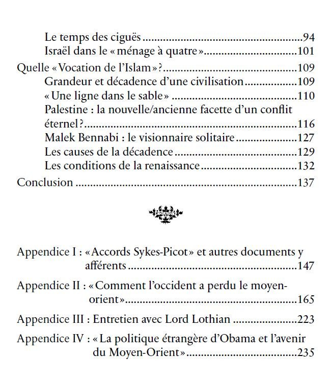 Comme le laisse supposer le titre de cet essai, nous nous proposons dans les cinq chapitres qui le composent de nous poser des questions et de tenter d’y répondre sur deux thèmes principaux : les tenants et les aboutissants de la tragédie actuelle du monde musulman et les traits caractéristiques de la relation passée, présente et future entre l’Orient et l’Occident. Dans cette perspective, nous veillerons constamment à ne pas tomber dans les travers de la théorie du complot, et ce en étayant, autant que faire se pourra, nos assertions par des preuves ou en indiquant les sources des informations données. Nous nous garderons aussi d’occulter ou de minimiser la responsabilité primordiale des musulmans, de leurs élites et de leurs dirigeants dans ce qui leur arrive aujourd’hui. Nous solliciterons l’histoire, la géographie et l’actualité internationale et nous emprunterons, inévitablement, des idées aux auteurs qui se sont intéressés à la problématique qui est la nôtre.