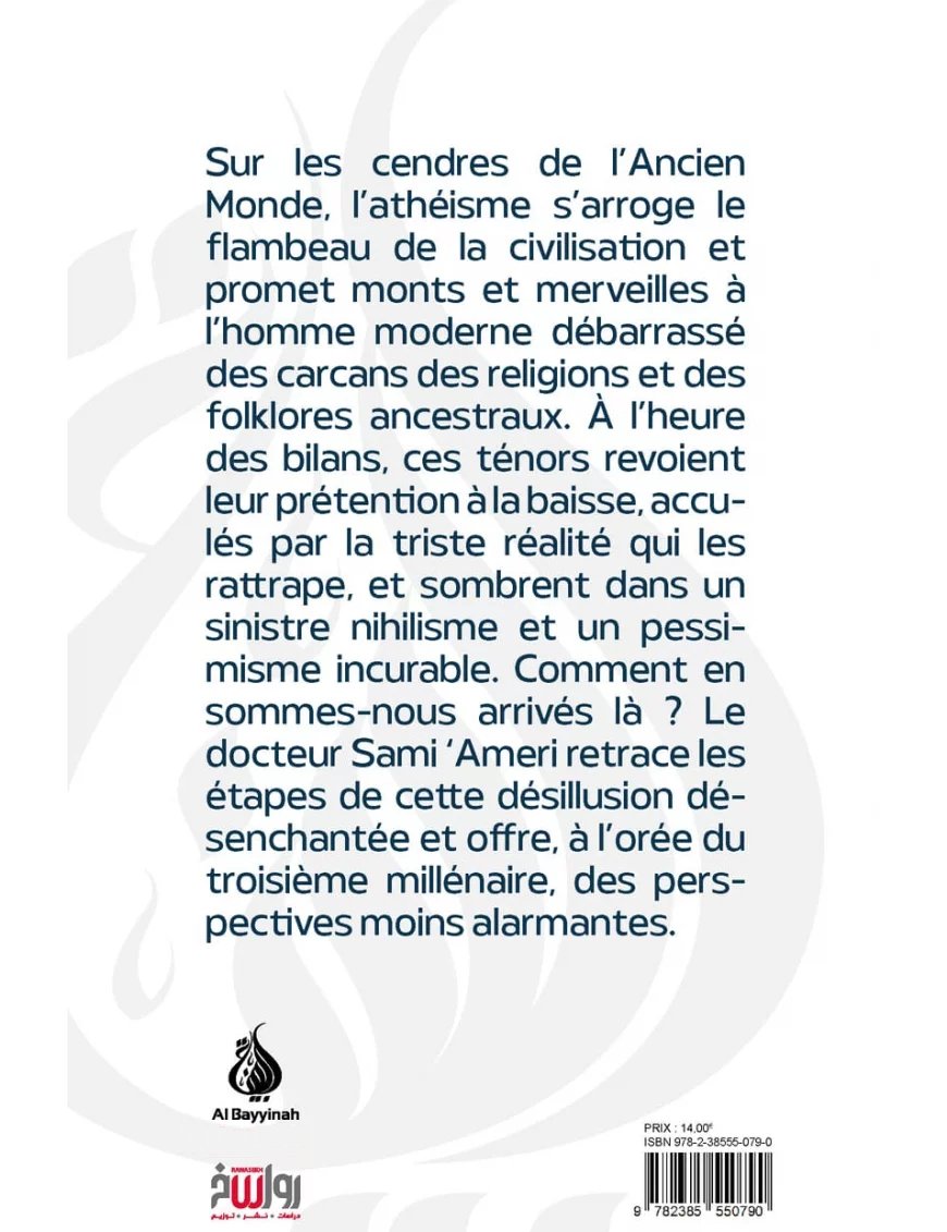 Sur les cendres de l’Ancien Monde, l’athéisme s’arroge le flambeau de la civilisation et promet monts et merveilles à l’homme moderne débarrassé des carcans des religions et des folklores ancestraux. À l’heure des bilans, ces ténors revoient leur prétention à la baisse, acculés par la triste réalité qui les rattrape, et sombrent dans un sinistre nihilisme et un pessimisme incurable. Comment en sommes-nous arrivés là ? Le docteur Sami ‘Ameri retrace les étapes de cette désillusion désenchantée et ore, à l’orée du troisième millénaire, des perspectives moins alarmantes.