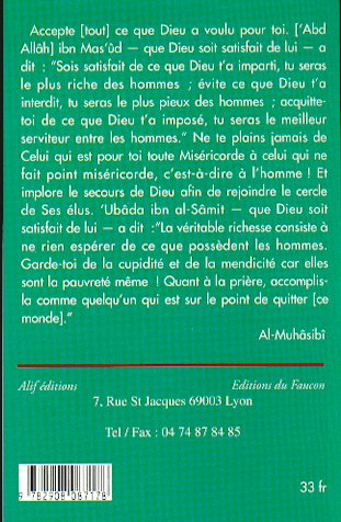Accepte [tout] ce que Dieu a voulu pour toi. [‘AbdAllâh] ibn Mas’ûd – que Dieu soit satisfait de lui – a dit : « Sois satisfait de ce Dieu t’a imparti, tu seras le plus riche des hommes ; évite ce que Dieu t ‘a interdit, tu seras le plus pieux des hommes ; acquitte toi de ce Dieu t’a imposé, tu seras le meilleur serviteur entre les hommes.» Ne te plains jamais de Celui qui est pour toi toute Miséricorde à celui qui ne fait point miséricode, c’est à dire l’homme ! Et implore le secours de Dieu afin de rejoindre le cercle de Ses élus. ‘Ubâda ibn al-Sâmit – que Dieu soit satisfait de lui – a dit : «La véritable richesse consiste à ne rien espérer de ce que possèdent les hommes. Garde toi de la cupidité et de la mendicité car elles sont la pauvreté même ! Quant à la prière, accomplis-la comme quelqu’un qui est sur le point de quitter [ce monde]»