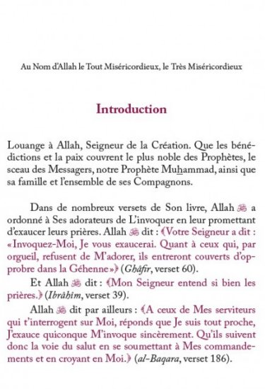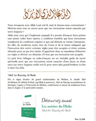 Ce petit livre, bilingue en arabe-français, est un véritable guide de survie spirituelle pour que nos invocations soient exaucées d’une façon ou d’une autre par notre Seigneur exalté soit-Il et ce, pour notre plus grand bonheur ici-bas et dans l’au-delà.