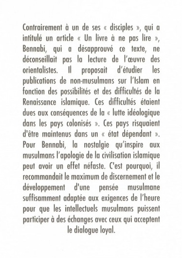 Contrairement à un de ses « disciples », qui a intitulé un article « Un livre à ne pas lire », Bennabi, qui a désapprouvé ce texte, ne déconseillait pas la lecture de l’œuvre des orientalistes. Il proposait d’étudier les publications de non-musulmans sur l’Islam en fonction des possibilités et des difficultés de la Renaissance islamique. Ces difficultés étaient dues aux conséquences de la « lutte idéologique dans les pays colonisés ». Ces pays risquaient d’être maintenus dans un « état dépendant ».