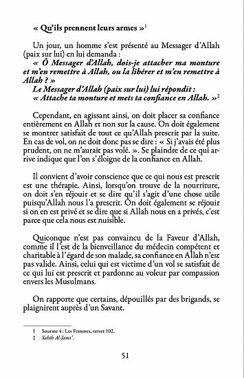 Quiconque n’est pas convaincu de la Faveur d’Allah, comme il l’est de la bienveillance du médecin compétent et charitable à l’égard de son malade, sa confiance en Allah n’est pas valide. Ainsi, celui qui est par exemple victime d’un vol se satisfait de ce qui lui est prescrit et pardonne au voleur par compassion envers les Musulmans.