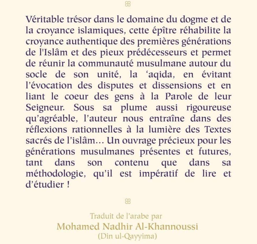 Véritable trésor dans le domaine du dogme et de la croyance islamiques, cette épître réhabilite la croyance authentique des premières générations de l’Islâm et des pieux prédécesseurs et permet de réunir la communauté musulmane autour du socle de son unité, la ‘aqida, en évitant l’évocation des disputes et dissensions et en liant le cœur des gens à la Parole de leur Seigneur. Sous sa plume aussi rigoureuse qu’agréable, l’auteur nous entraîne dans des réflexions rationnelles à la lumière des Textes sacrés de l’islâm… Un ouvrage précieux pour les générations musulmanes présentes et futures, tant dans son contenu que dans sa méthodologie, qu’il est impératif de lire et d’étudier ! L’auteur : Abû al-Qâsim Muhammad ibn Juzayy al-Kalbî – 693-741AH (1294-1340) Illustre érudit malikite andalou et khatîb de la grande mosquée de Gharnâtah (Grenade), engagé dans les grandes affaires de son temps jusqu’à rendre l’âme à la bataille de Tarîfa (Rio Salado), Abû al-Qâsim ibn Juzayy nous a laissé un héritage fabuleux dans toutes les disciplines des sciences islamiques, du fiqh au tafsîr, à la langue arabe, au hadîth ou à l’adab.