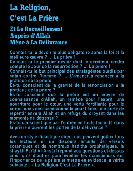 Avec un style didactique et direct, émaillé de versets coraniques et de nombreux hadiths prophétiques, le shaykh Farîd AL-Ansârî répond aux questions que peuvent se poser tout un chacun et ce, pour éveiller les consciences sur l’importance de la prière et mettre en évidence l'axiome suivant : «La Religion c’est la Prière ».