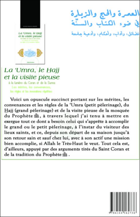Voici un opuscule succinct portant sur les mérites, les convenances et les règles de la 'Umra (Petit pèlerinage), le Hajj (Grand pèlerinage), et la visite pieuse de la mosquée du Prophète (SAAW)... Tout cela appuyé par des arguments tirés du Saint Coran, et de la tradition du Prophète (SAAW).