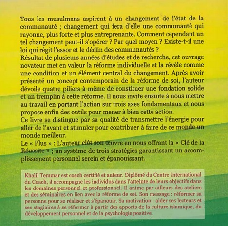 Partant du verset : « En vérité, Dieu ne modifie point l’état d’un peuple tant que les hommes qui le composent n’auront pas modifié ce qui est en eux-mêmes » (S13 V11), l’auteur propose dans ce livre des orientations pour réformer sa personne, des outils à même de réveiller les consciences et des repères pour stimuler les énergies et développer la confiance et l’optimisme.