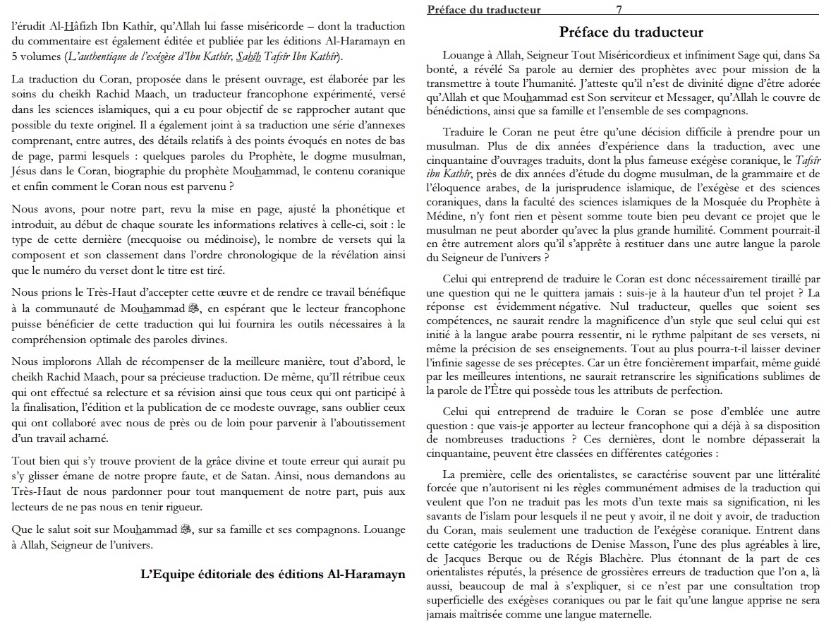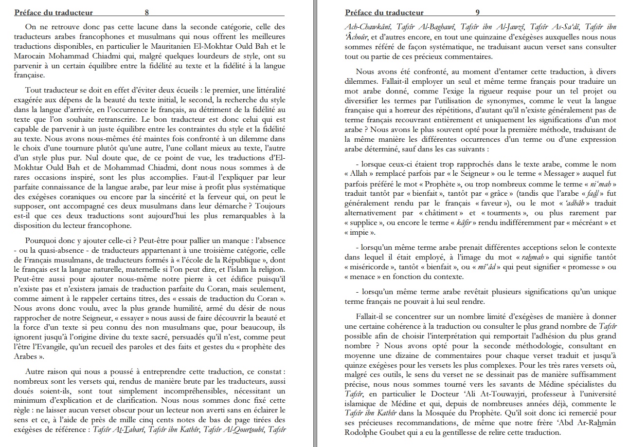 Voici l’une des traductions du Saint Coran les plus claires, les plus agréables à lire et les plus fidèles au texte arabe. L’auteur, ancien élève du cheikh Sâlih Al-Fawzân, auprès de qui il a notamment suivi des cours d’exégèse coranique, est diplômé du Centre d’études islamiques de la Mosquée du Prophète à Médine, où il a étudié des sciences aussi diverses que la croyance et la jurisprudence islamiques, les sciences du Coran et du hadith, l’exégèse coranique, la grammaire et l’éloquence arabes. Il est également traducteur du Tafsîr ibn Kathîr, l’exégèse la plus connue du Coran. Il s’est notamment appuyé, dans sa traduction, sur près de quinze exégèses de référence.