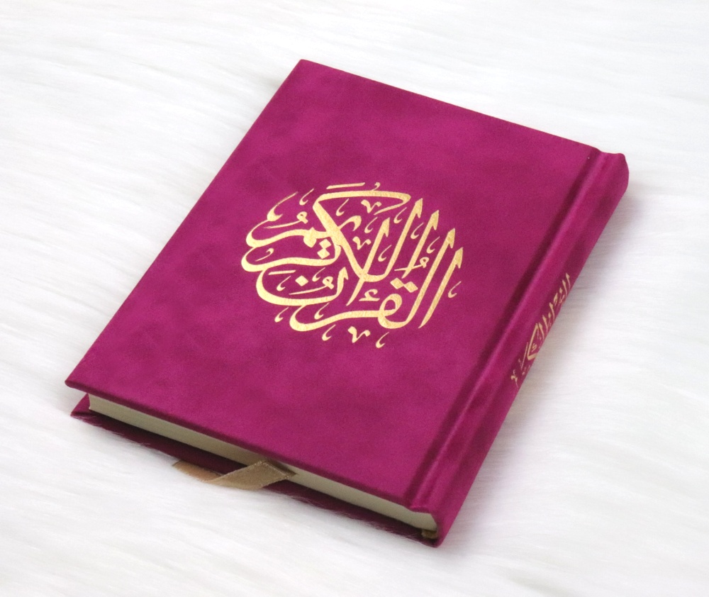 Le Coran couverture rigide de luxe couverture en daim dorée (10 x 14 cm) - Couleur Fuchsia - مصحف ورق المدينة مخمل Livre