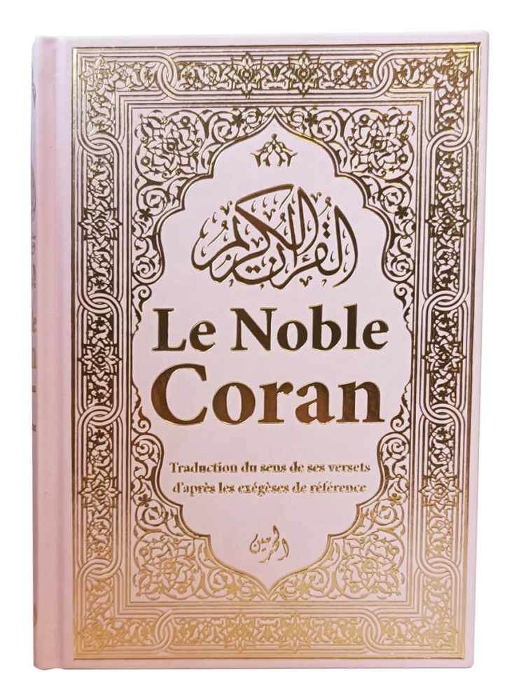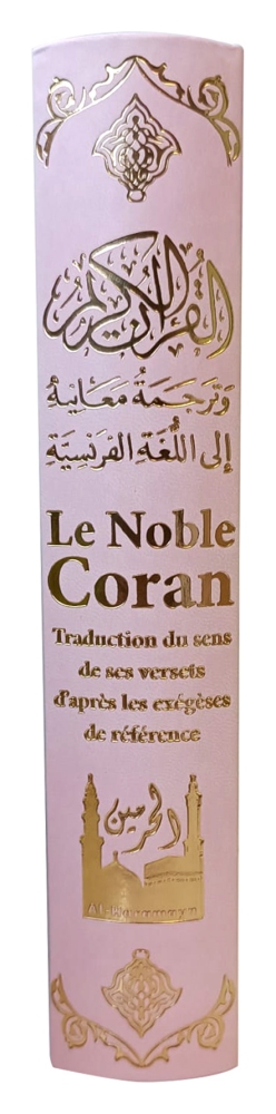 Couverture cuir de luxe rose dorée. Bilingue français/arabe. Coran version arabe en lecture Hafs et sa traduction française en vis à vis sur la même page. Existe en d'autres couleurs de couverture : Blanc, Noir, Mauve foncé...