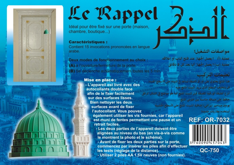 Cet appareil électronique vous offre la possibilité d'écouter des invocations (dhikr et dou'a) qui vous accompagneront durant le jour et la nuit... Il se fixe sur une porte qui s'ouvre de n'importe quel côté.