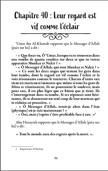C’est pour cette raison que j’ai collecté, dans cet ouvrage, des récits terrifiants, des avertissements contre les péchés, des narrations décrivant les châtiments et des histoires qui mettent le cœur dans un état inconfortable. Tout cela dans le but de rendre le confiant anxieux, d’attendrir les cœurs durs, de faire naitre des larmes dans les yeux secs, et de motiver le paresseux.