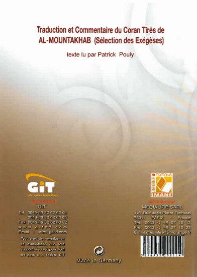 Le Saint Coran - Sourate El Fatiha, Ayat Al-Kursi et Sourate Al-Imran (Arabe-Français) Traduction et commentaire du Coran tirés de Al-Mountakhab (Selection des Exegeses). Texte lu par Patrick Pouly.