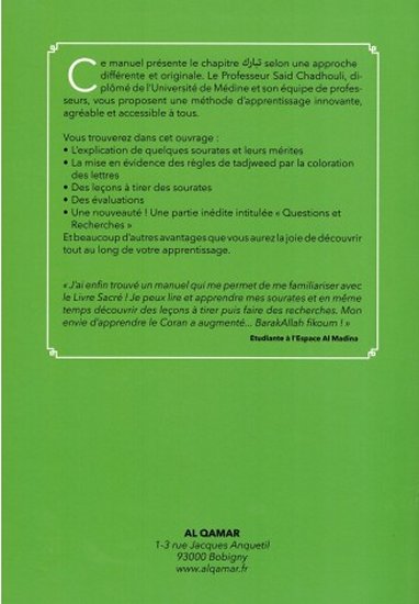 Ce manuel présente le chapitre Tabarak du Saint Coran, selon une approche originale qui consiste en :