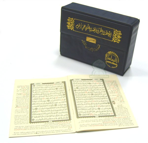 Cartable contenant le Saint Coran complet divisé en "30 juz" (chaque juz' contient deux hizb). Impression en plusieurs couleurs.