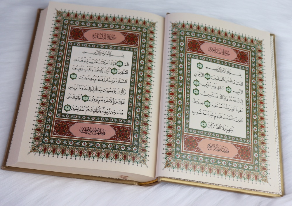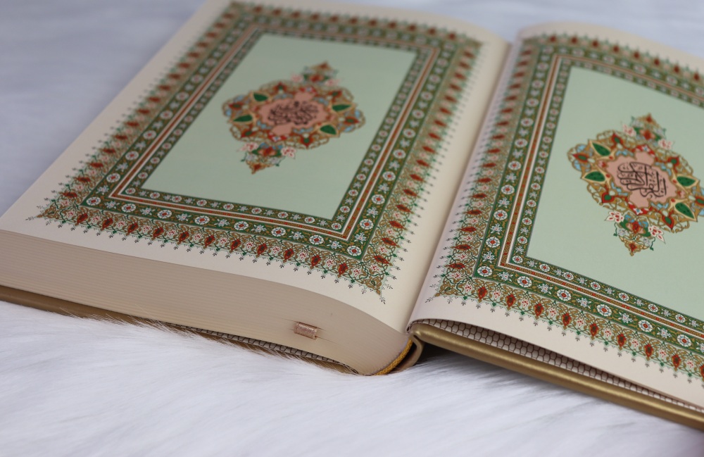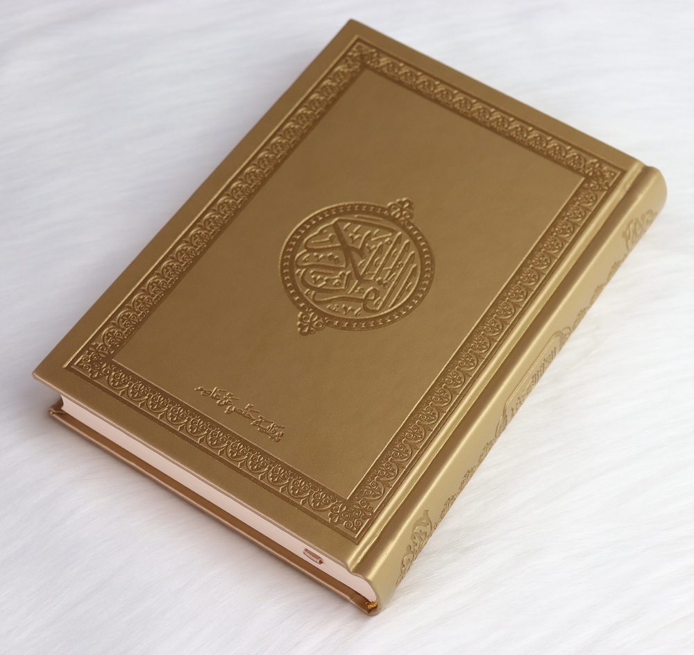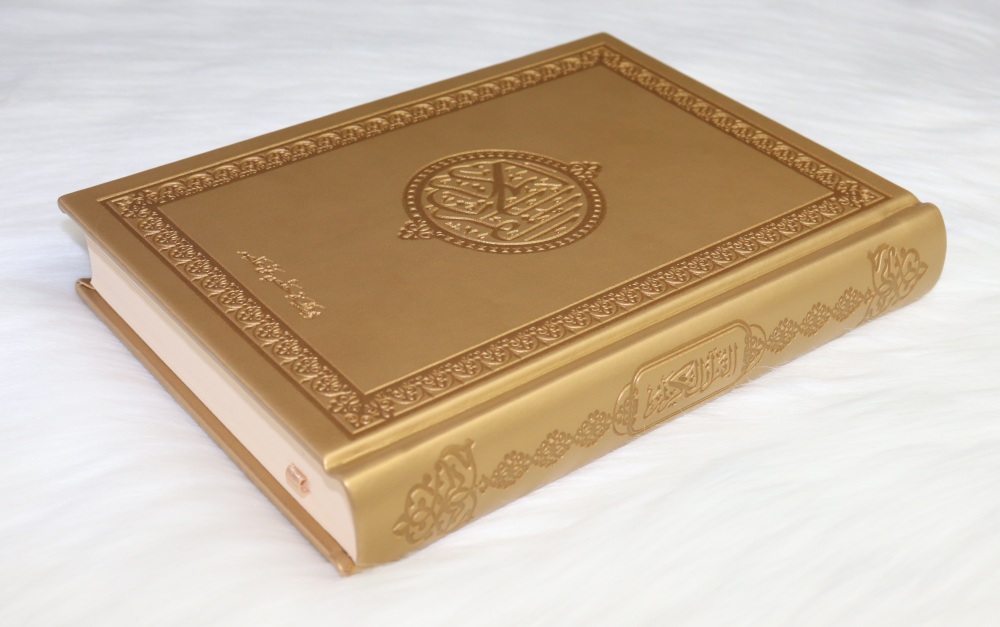 Coran de luxe format moyen avec couverture de type cuir dorée. Très doux au toucher, agréable à manier et ne ramasse pas la poussière.