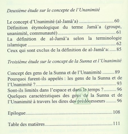 Cette étude est une contribution à la clarification de ce sujet: La description du concept "des gens de la Sunna et de l'unanimité" à travers les textes du Saint Coran et de la Sunna, tel qu'il a été compris par les compagnons, leurs successeurs, les pieux prédécesseurs représentés par les imams de la guidée, les gens du hadith et de la jurisprudence. Ils sont les modèles agréés par la communauté dont elle a reçu la religion. Voici donc un modeste geste de ma part pour éclaircir ce point.