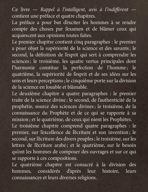 Ce livre — Rappel à l’intelligent, avis à l’indifférent — contient une préface et quatre chapitres. La préface a pour but d’inciter les hommes à se rendre compte des choses par l’examen et de blâmer ceux qui acquiescent aux opinions toutes faites.