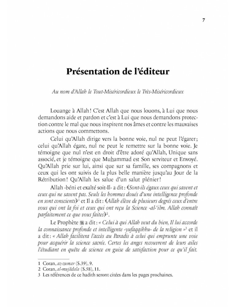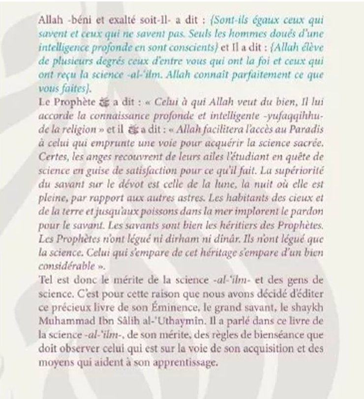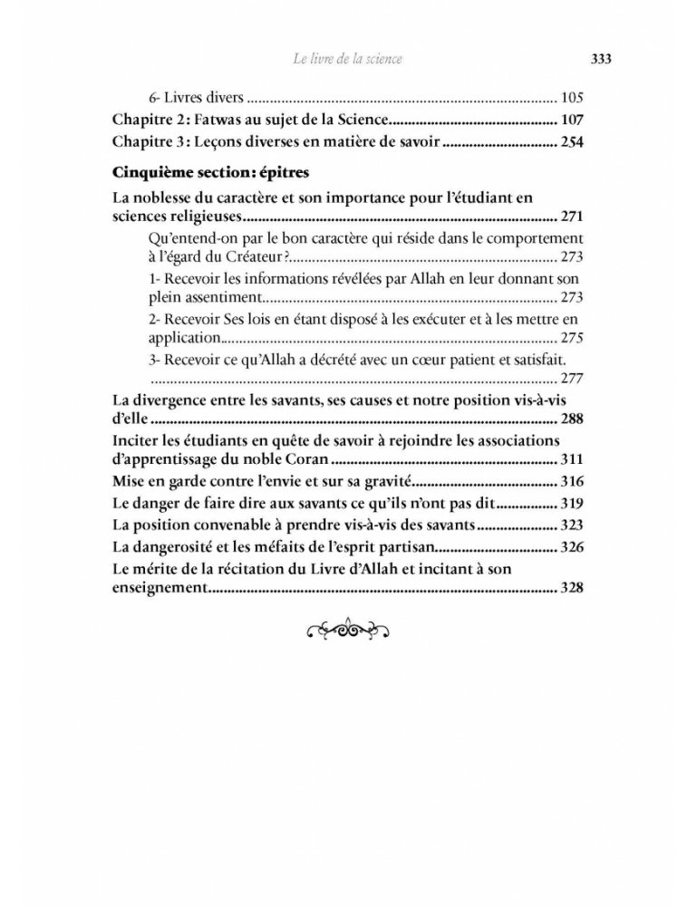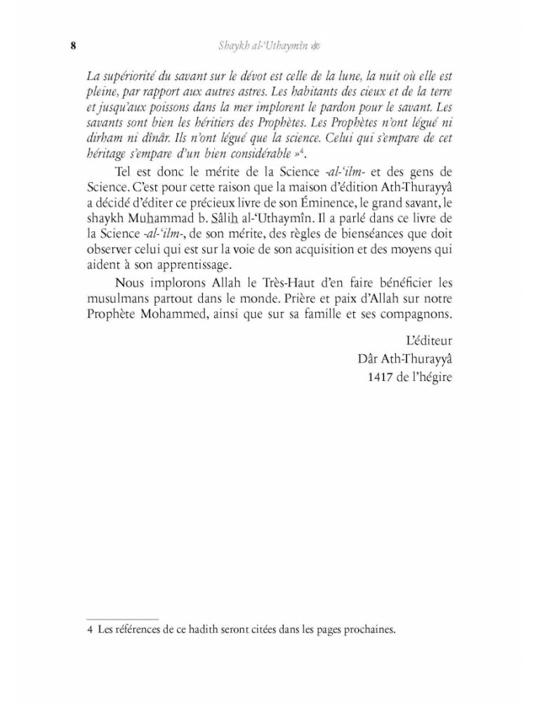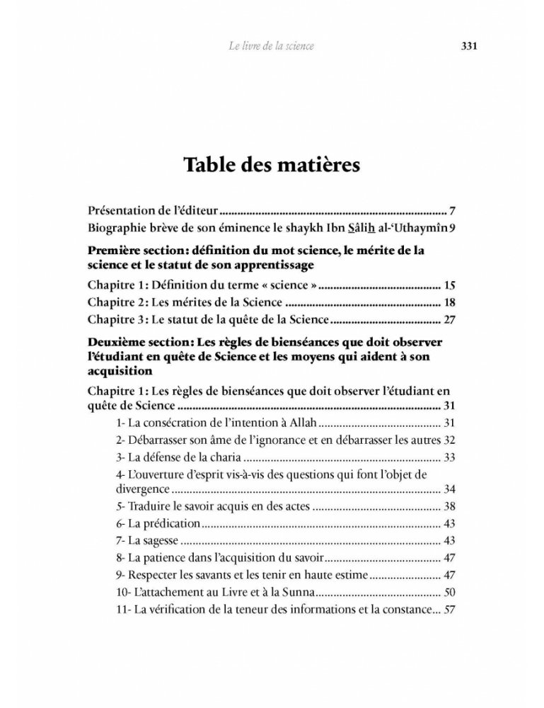 Le livre de la science (Kitab Al-'ilm) - كتاب العلم, écrit par le Shaykh Mouhammad Ibn Sâlih Al-'Outhaymîn est une référence dans l'apprentissage pour tout étudiant en science. Cet ouvrage publié sous la supervision de la Fondation de Bienfaisance du Shaykh Ibn Sâlih Al Outhaymîn. Il est d'un grand intérêt pour tout musulman qui souhaite s'éduquer sur les différents moyens de l'acquisition de la science religieuse.