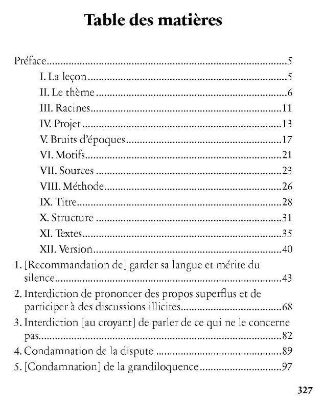 Il n'est donc pas anodin que ce soit le premier hadith que rapporte l'imam Ibn Abî al-Dunyâ dans son Livre du silence. Le lecteur trouvera, dans ce classique du patrimoine islamique, 760 récits du Prophète (paix et salut sur lui), d'autres prophètes, mais aussi de pieux prédécesseurs, autour des thématiques du silence et de l'éthique de la parole en islam.