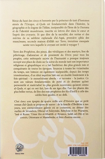 C’est donc une épopée de quatre mille ans d’Histoire que ce petit roman d’al-Quds se propose de narrer : de la famille d’Ibrâhîm à nos jours, une extraordinaire galerie où se croiseront, au détour des ruelles de Jérusalem, Dâwud et Suleymân, Babylone et les Pharaons, ‘Issâ et Rome, ‘Umar ibn al-Khattâb et Byzance, Salâh ad-Dîn et les croisés, Ottomans et Mamelouks, et bien d’autres encore…