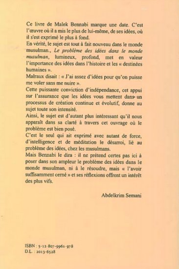 Mais Bennabi le dira : il ne prétend certes pas ici à poser dans son ampleur le problème des idées dans le monde musulman, ni à le résoudre, mais « l'avoir suffisamment cerné » et ses réflexions offrent un intérêt des plus vifs.