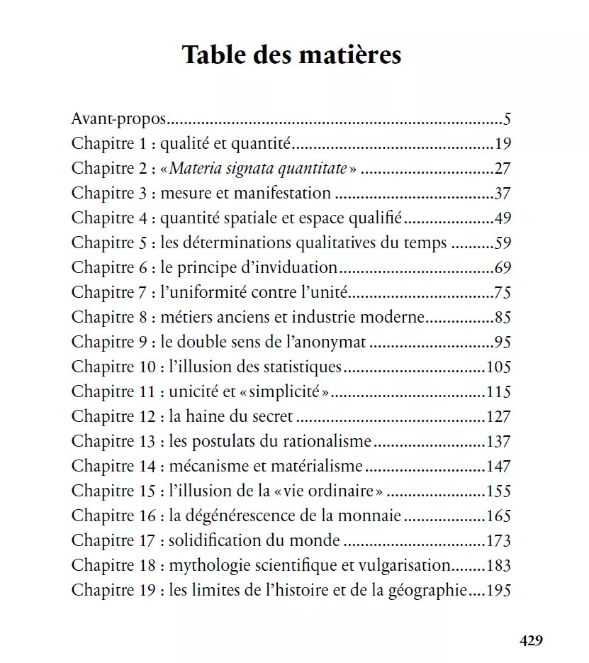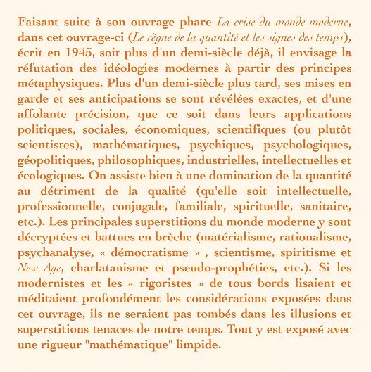Faisant suite à son ouvrage phare La crise du monde moderne, dans cet ouvrage-ci (Le règne de la quantité et les signes des temps), écrit en 1945, soit plus d'un demi-siècle déjà, il envisage la réfutation des idéologies modernes à partir des principes métaphysiques. Plus d'un demi-siècle plus tard, ses mises en garde et ses anticipations se sont révélées exactes, et d'une affolante précision, que ce soit dans leurs applications politiques, sociales, économiques, scientifiques (ou plutôt scientistes), mathématiques, psychiques, psychologiques, géopolitiques, philosophiques, industrielles, intellectuelles et écologiques. On assiste bien à une domination de la quantité au détriment de la qualité (qu'elle soit intellectuelle, professionnelle, conjugale, familiale, spirituelle, sanitaire, etc.).