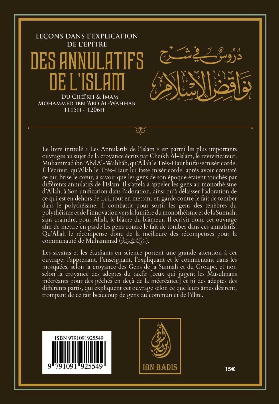 Ce livre écrit par Muhammad ibn ‘Abd Al-Wahhāb intitulé « Les Annulatifs de l’Islam » est des plus importants parmi les ouvrages relatifs à la croyance. Il l’écrivit,après avoir constaté que les gens de son époque pratiquaient sans le savoir, différents annulatifs de l’Islam. Il s’attela à appeler les gens au monothéisme d’Allah, à Son unification dans l’adoration, ainsi qu’à délaisser l’adoration de ce qui est en dehors de Lui, tout en mettant en garde contre le fait de tomber dans le polythéisme.