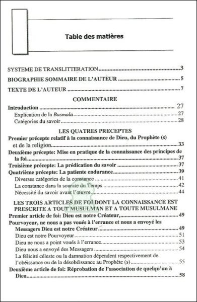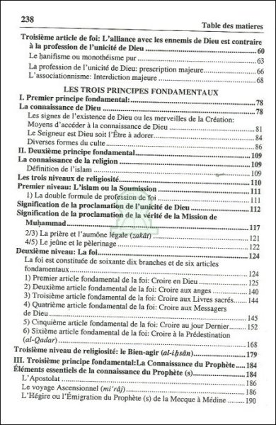 Dans le présent livre, l'Imam Muhammad ibn 'Abdal Wahhâb démontre que les principes fondamentaux que l'homme doit connaître sont au nombre de trois. Le premier principe consiste en la connaissance d'Allah , Celui qui a subvenu à tous nos besoins en nous octroyant les différents bienfaits, c'est Lui que nous adorons et il n'y a nul autre que Lui. Le deuxième principe est de connaître la religion par l'intermédiaire des preuves, il explique que notre religion est l'Islam qui consiste à se soumettre à Allah en pratiquant le monothéisme, se soumettre à Lui en Lui obéissant, désavouer totalement le polythéisme et ses partisans. Le troisième et dernier principe est la connaissance du Prophète Mohammed -Prière et Salut sur lui-.