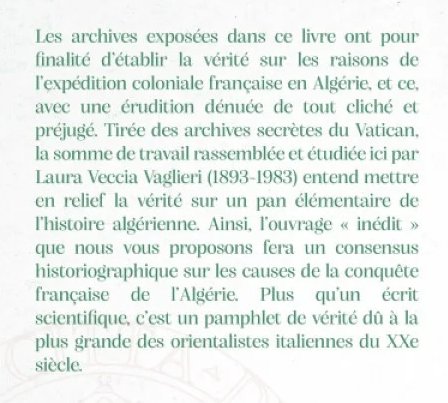 Les archives exposées dans ce livre ont pour finalité d’établir la vérité sur les raisons de l’expédition coloniale française en Algérie, et ce, avec une érudition dénuée de tout clichés et préjugés. Tirée des archives secrètes du Vatican, la somme de travail rassemblée et étudiée ici par Laura Veccia Vaglieri (1893-1983) entend mettre en relief la vérité sur un pan élémentaire mais néanmoins occulté de l’histoire algérienne. Ainsi,cet ouvrage « inédit » que nous vous proposons fera consensus sur les causes de la conquête française de l’Algérie. Plus qu’un écrit scientifique, c’est un "pamphlet de vérité" dû à la plus grande des orientalistes italiennes du XXe siècle.